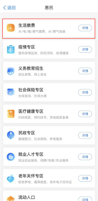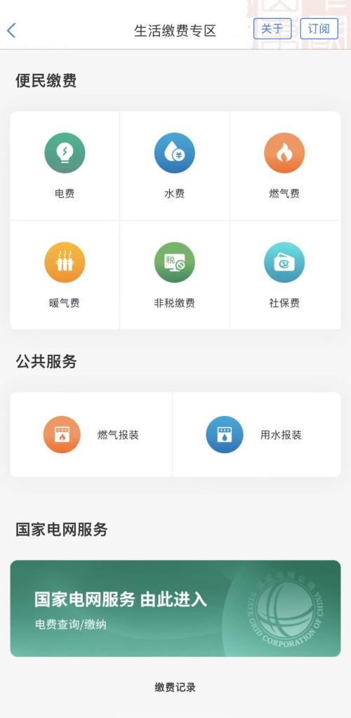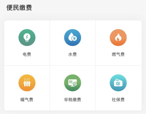 “便民缴费”板块包含“电费”“水费”“燃气费”“暖气费”“非税缴费”“社保费”六种常用缴费功能。