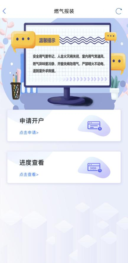 点击“申请开户”,阅读用户须知,选择报装地区及服务单位,选择用户类型,填写报装信息,上传相关证件后提交报装申请即可。申请完成后,还可以在“进度查看”中查看已申报、受理中、已取消和已办结的报装事项。
