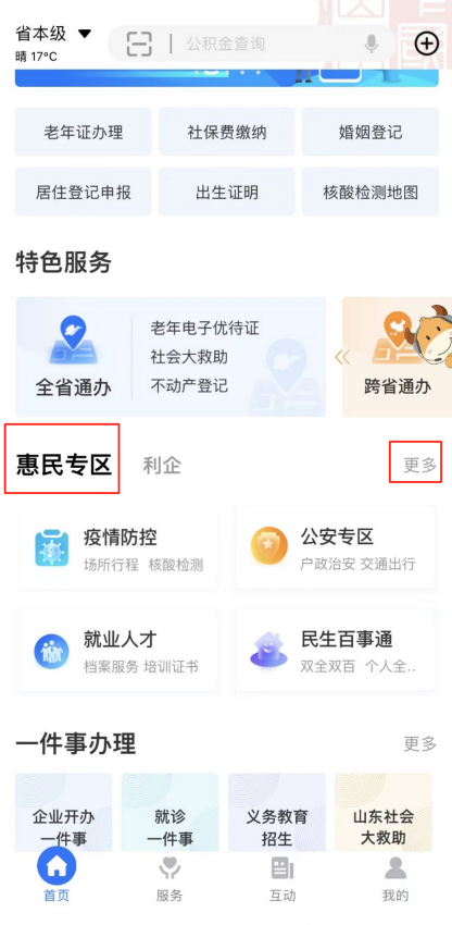进入“爱山东”APP,下滑找到“惠民专区”,点击右侧“更多”,即可进入生活缴费专区。