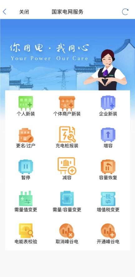 “国家电网服务”板块涵盖“个人新装”“充电桩报装”“开通峰谷电”“更名/过户”等15项电力服务,个人用户和企业用户可以根据自身需求办理业务。