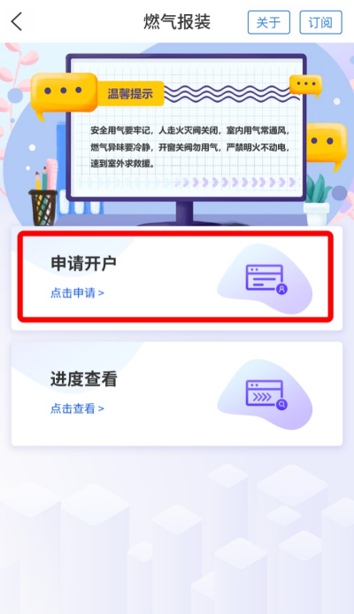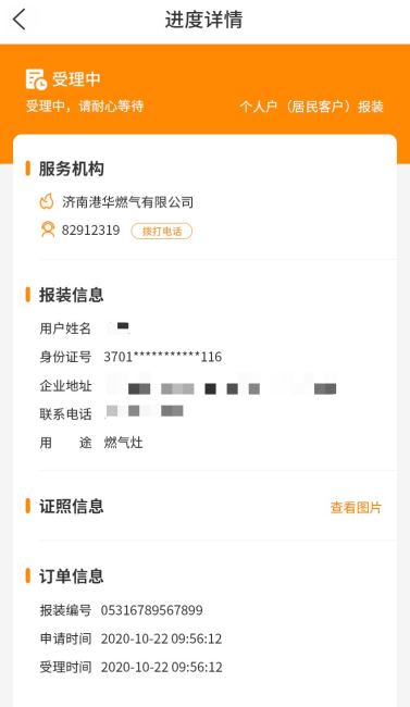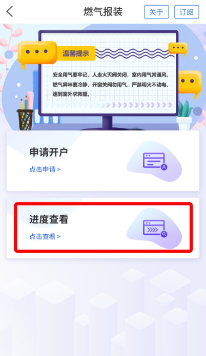 *报装申请提交成功后,还可在燃气报装服务首页查看办理进度。