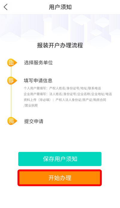 2、点击“申请开户”,阅读用户须知,点击“开始办理”;