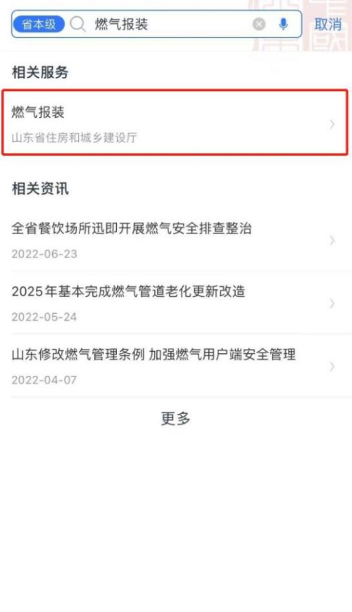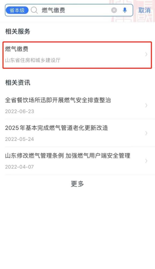 打开“爱山东”APP,首页搜索“燃气缴费”,点击进入;