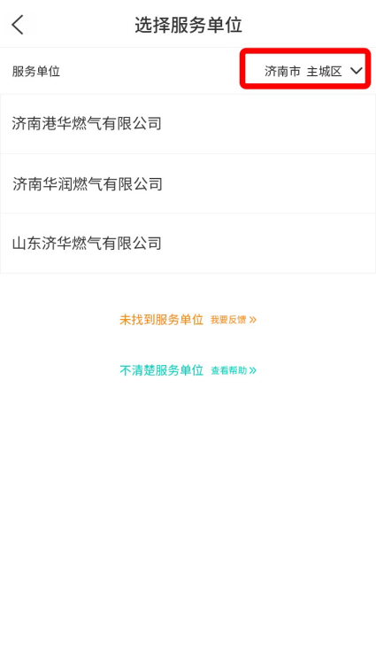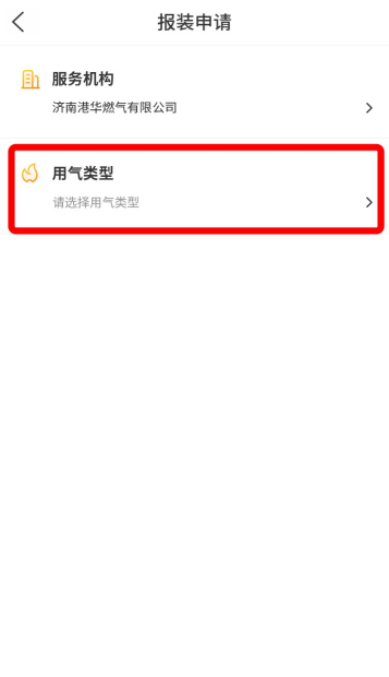 3、选择服务单位(右上角可切换地区),跳转至“报装申请”界面后,选择“用气类型”;