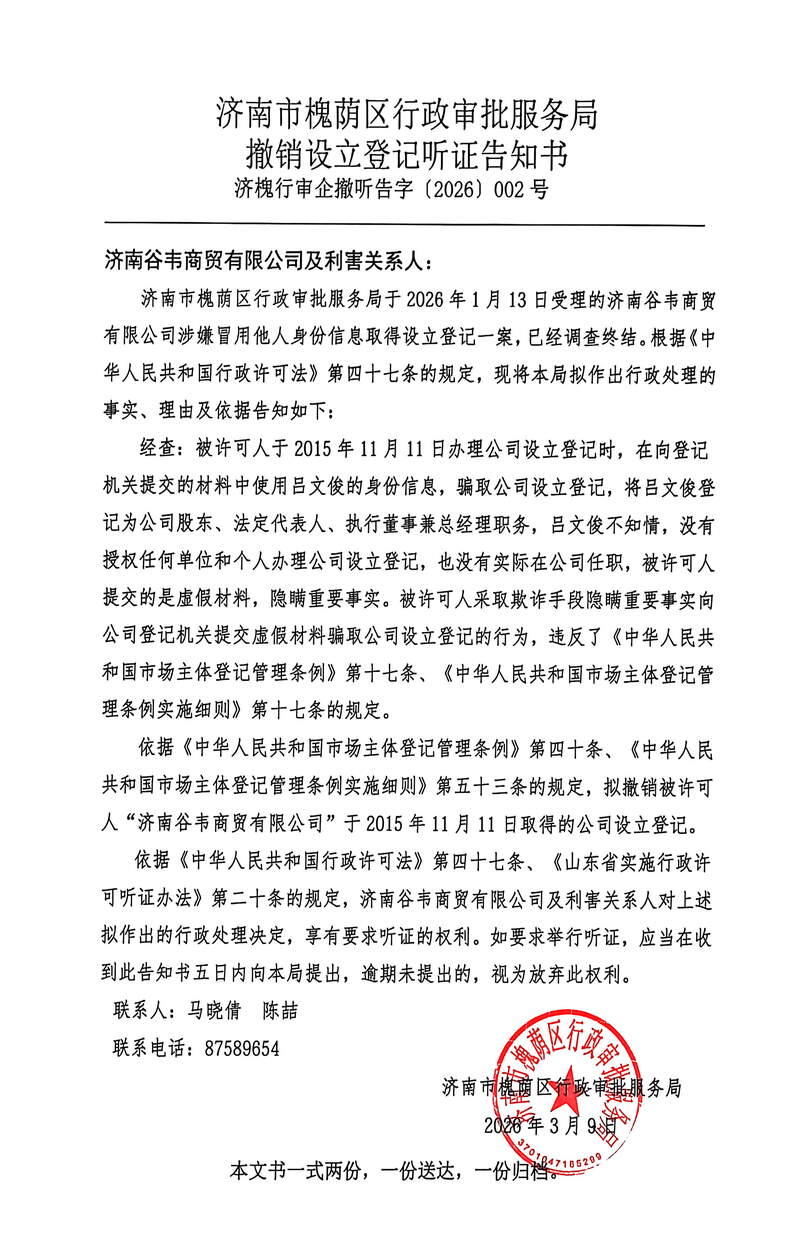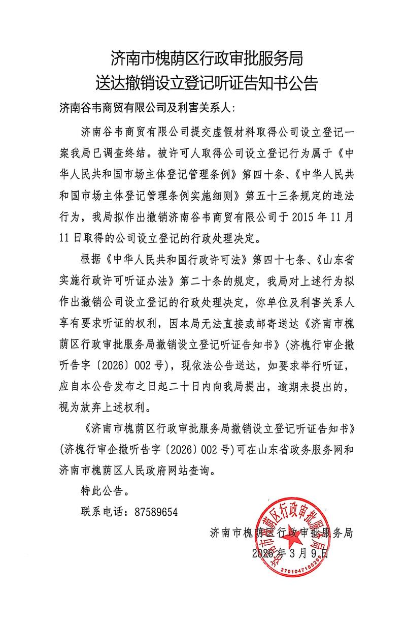 撤销设立登记听证告知书及公告送达【2026】第002号(济南谷韦商贸有限公司)