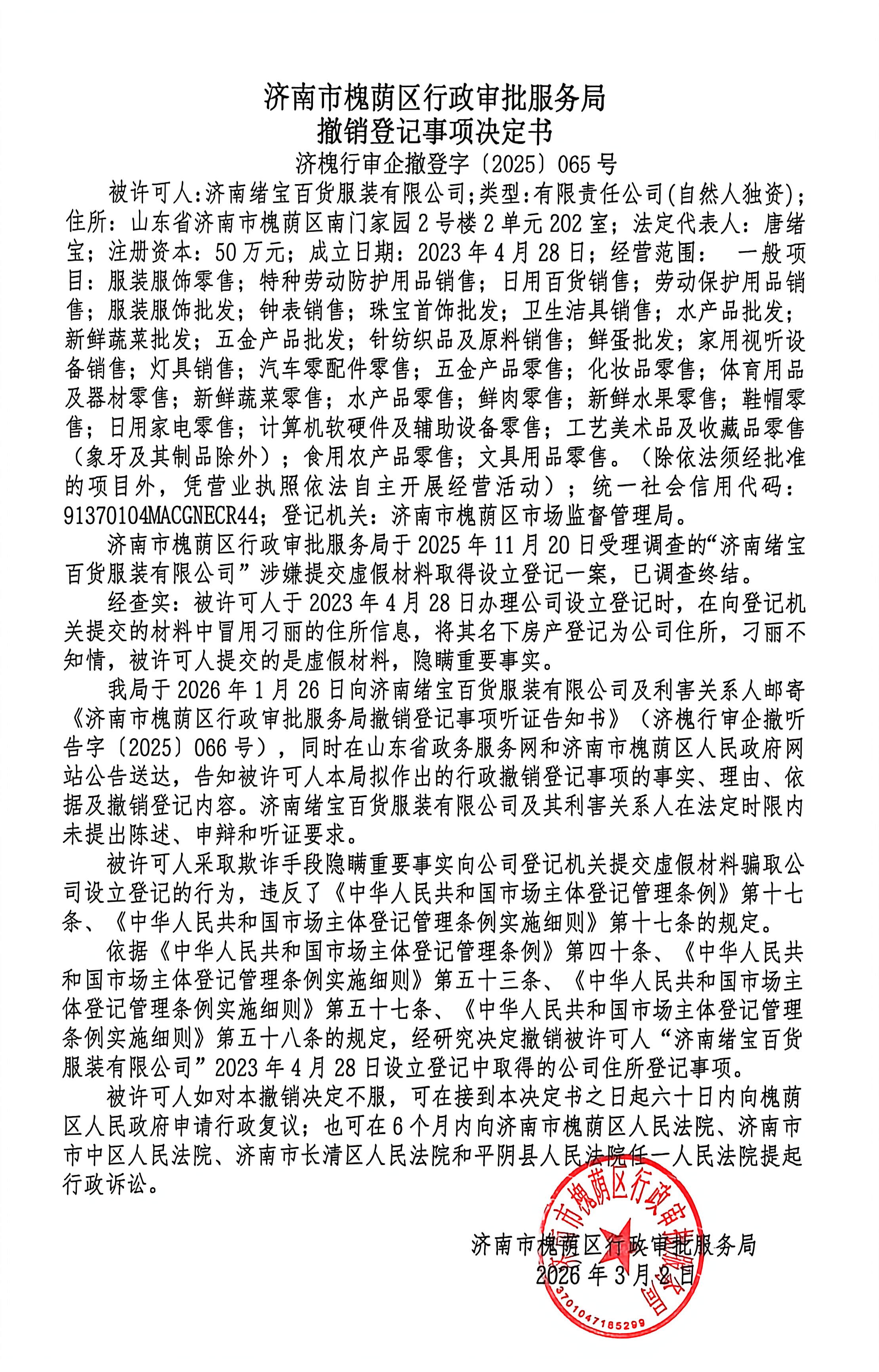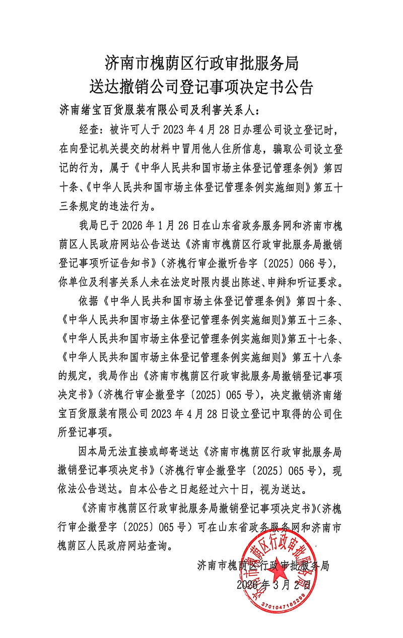 撤销登记事项决定书及公告送达【2025】第065号(济南绪宝百货服装有限公司)