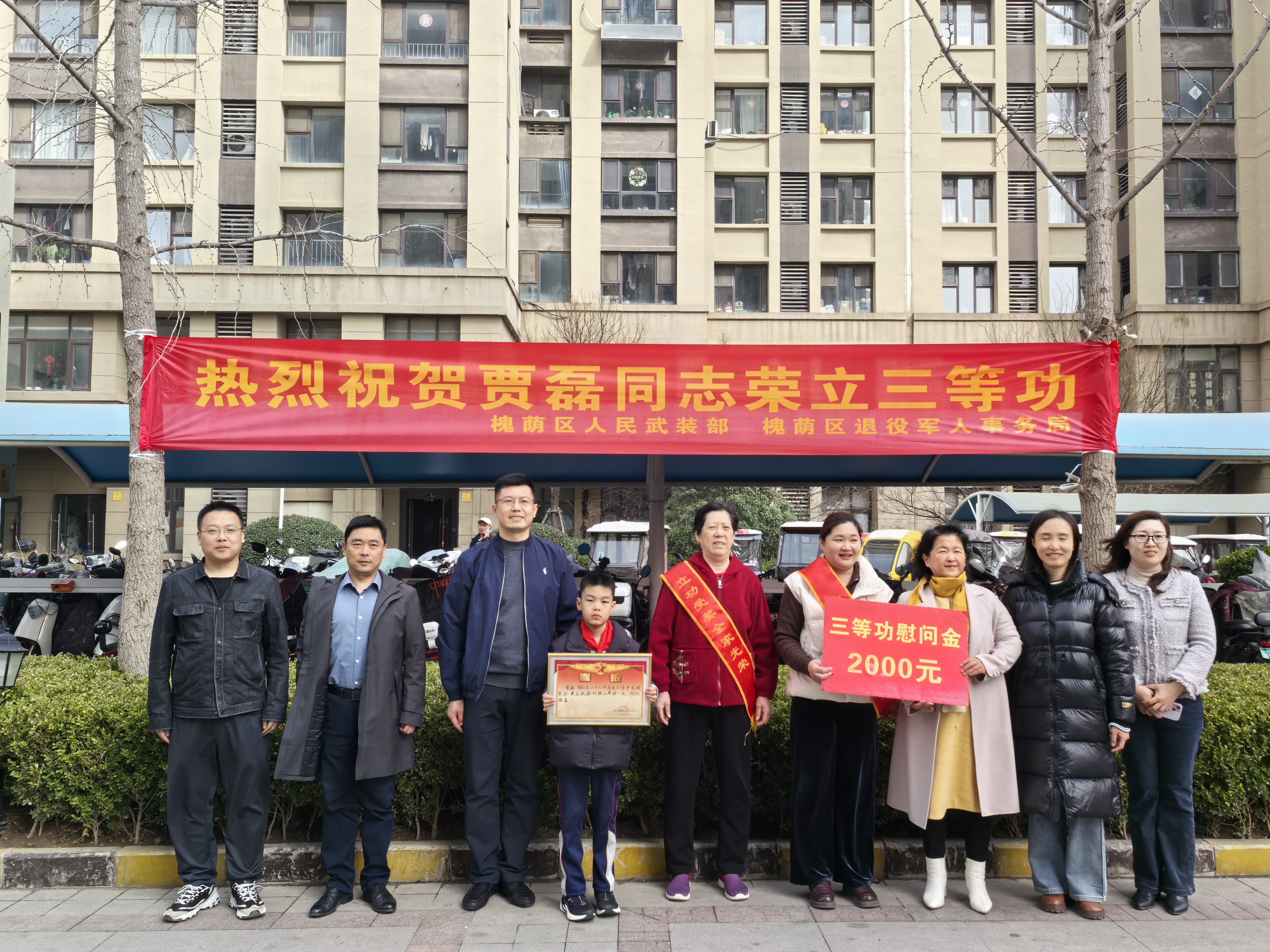 一人当兵,全家光荣;一人立功,全家荣耀。3月12日上午,槐荫区退役军人事务局二级调研员全英兰、张庄路街道综合行政执法中心(退役军人服务站)主任周广欣、退役军人服务站站长满英卫及服务站、社区相关工作人员带着满满的敬意与关怀,为荣立三等功的贾磊、牛聪同志家属送上了立功喜报和慰问金,让军人家属共享尊崇荣光。
