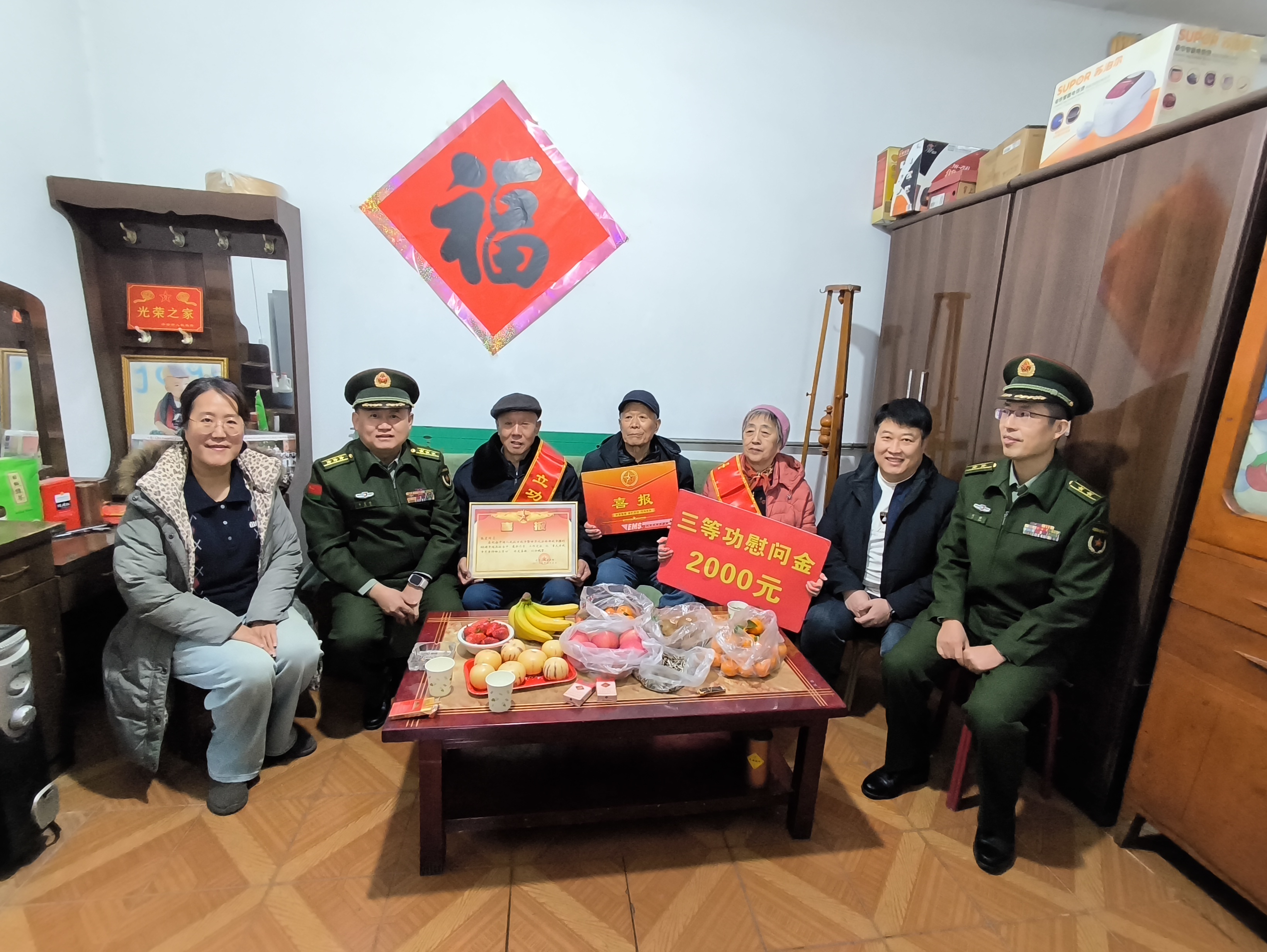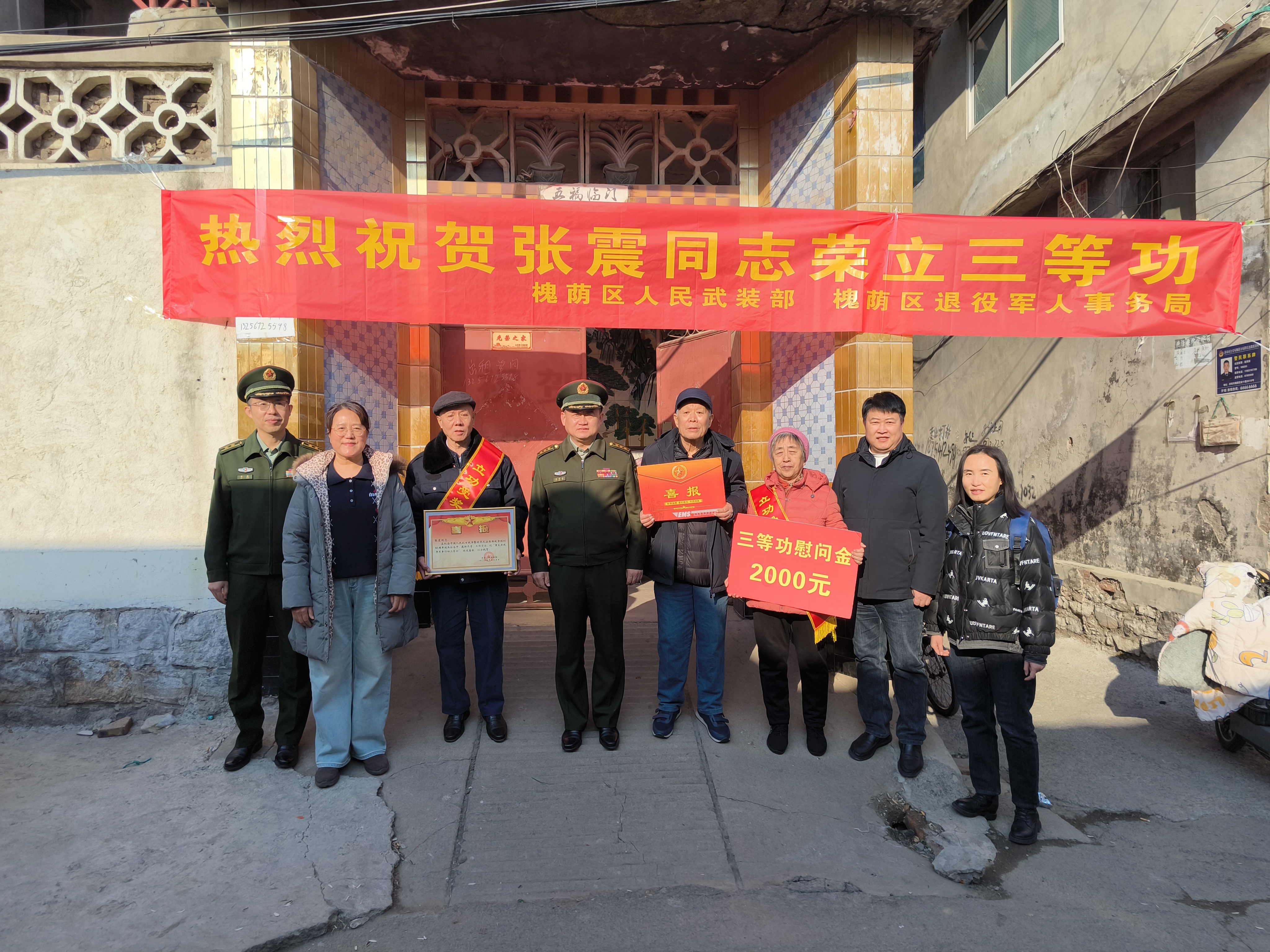 冬日午后温暖的阳光洒在段店北路街道的一个老小区里,在喜庆的氛围中,在邻里的称赞中,慰问组一行将三等功喜报交到军属手中,为他们披上光荣的绶带,向军属致以崇高的敬意和诚挚的祝贺。