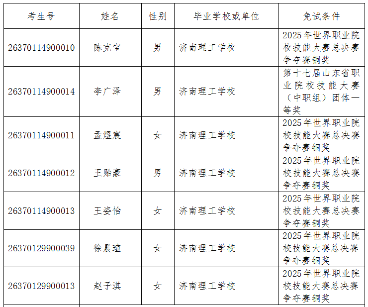 按照鲁招考〔2025〕105号《关于做好山东省2026年普通高等学校招生考试报名工作的通知》文件要求,现将槐荫区2026年特殊考生及技能拔尖人才名单公示如下: