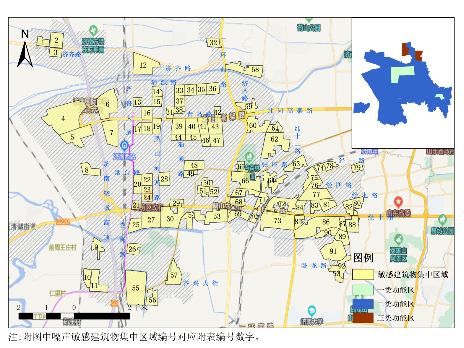本次共划定敏感建筑物集中区域93块,面积22.84平方公里,占槐荫区1类和2类声功能区面积的30.04%,占槐荫区总面积的15.0%。详见附件1和附件2。